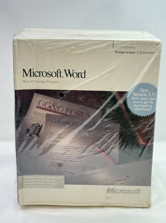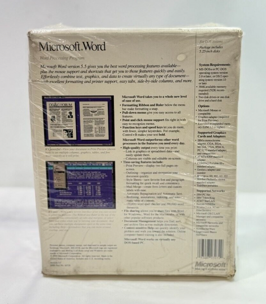 Brand: MicrosoftType: Office Software SuitesFormat: 5.25 in Floppy DiscLanguage: EnglishLicense Category: Business-to-ConsumerModel: Microsoft Word Academic EditionFor Operating Systems: Windows Microsoft Word Version 5.0 1988 - 5 1/4" Discs Sealed original box (RG299) Item is new and...Regular price $300.00Quick view -