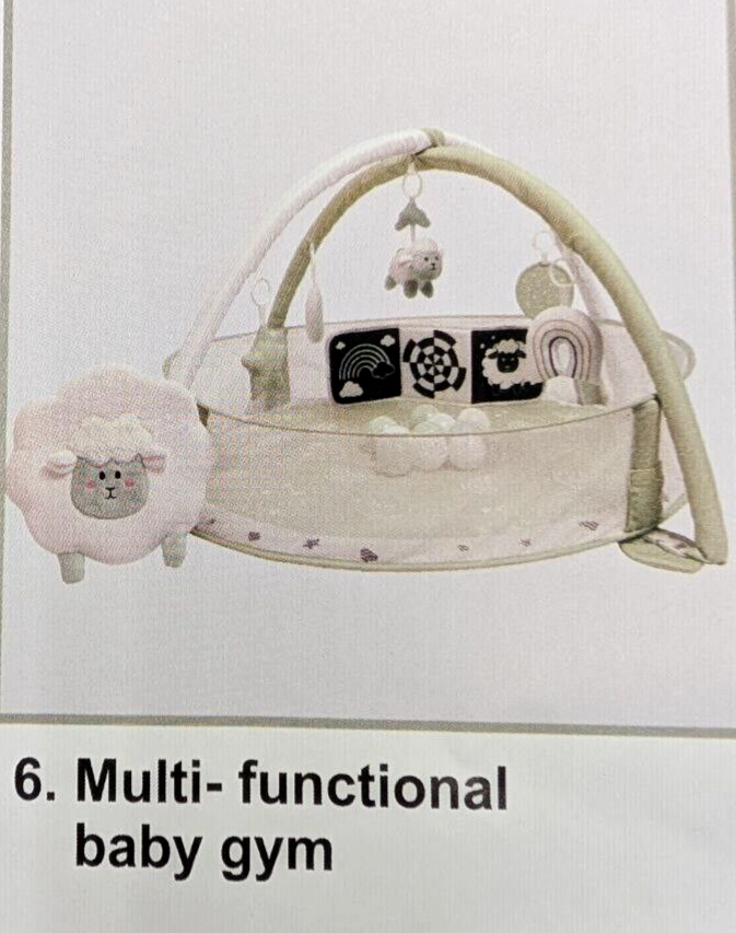 - This versatile baby playmat encompasses 6 different uses: tummy time mat, baby activity center, pop up mesh fence, high contrast book, ball pit with balls included and lamb storage bag.