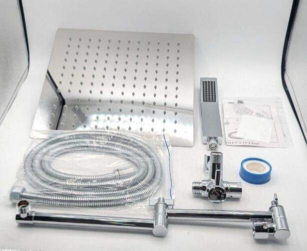 - 12" rainfall shower head with handheld wand. Both are metal constructions that are not easy to break.