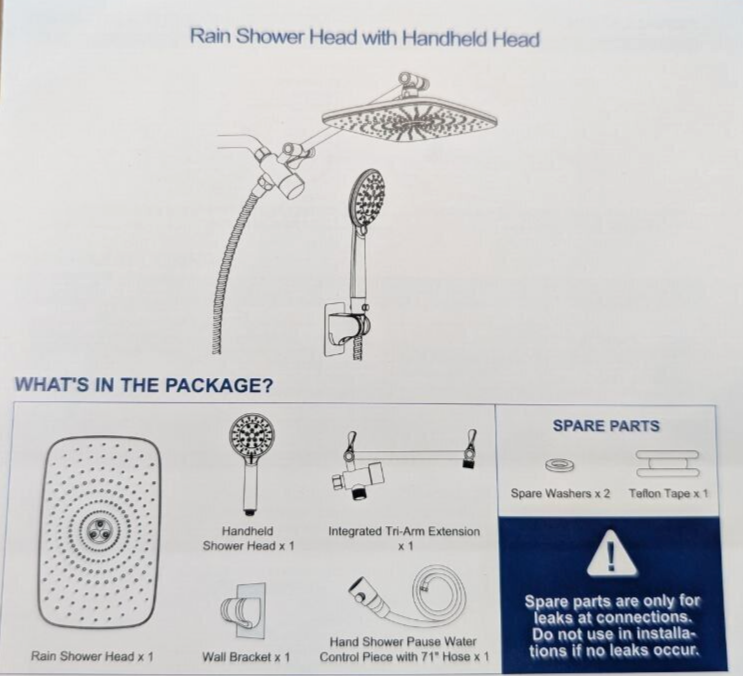 • Included components: ‎Rain Shower Head x 1, Spare Washers x 2, Handheld Shower Head x 1, Integrated Tri-Arm Extension x 1, 71" Hose x 1