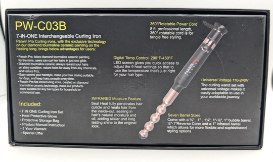 Sold out              Vendor: PARWIN PRO BEAUTY PARWIN PRO BEAUTY Curling Iron Wand Set, 7 in-1 Interchangeable Barrels Brand: PARWIN PRO BEAUTYType: Curling WandPower Source: ElectricHeating Plate Material: Ceramic & TourmalineColor: Black/RoseModel: PW-C03BFeatures: Auto Shut-Off,Interchangeable Barrels,Swivel CordMaterial: Ceramic,PlasticCountry/Region of Manufacture: ChinaMaximum Temperature: 450 °FPower: 110W PARWIN PRO BEAUTY Curling Iron Wand Set, 7 in-1...Regular price $32.99Quick view