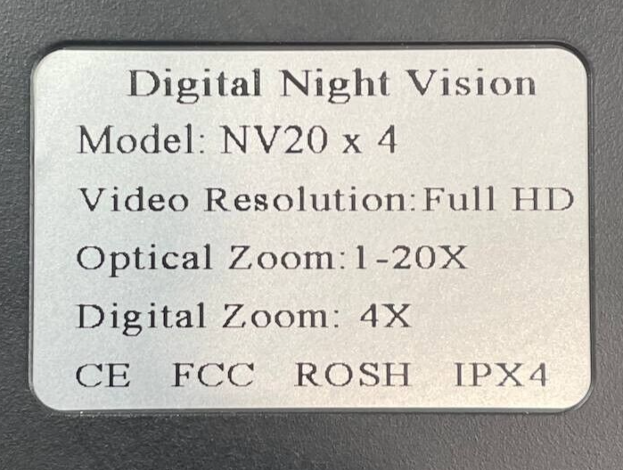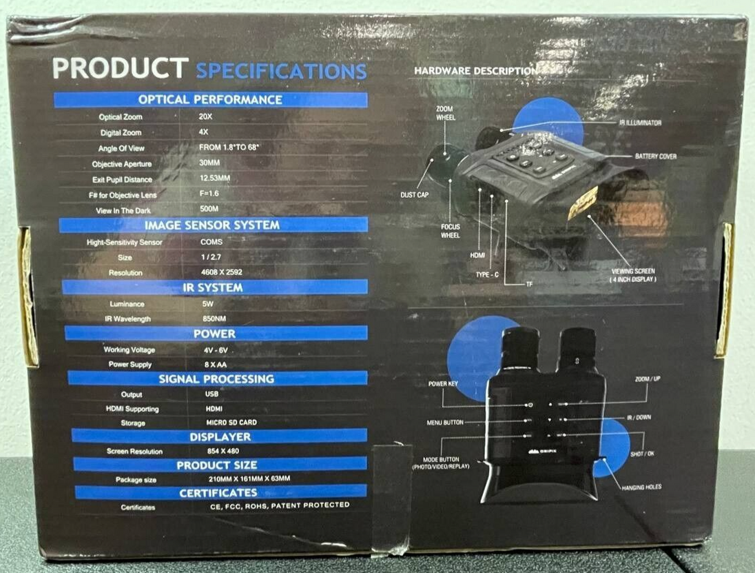 Features: Night Vision,20X Optical Magnification,4x Digital zoom Magnification,Day & Night Image/Video,1080P Full HD Video Resolution,5W 850NM Laser Illuminator