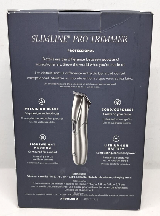 Motor Type: RotaryCutting Lengths: #1,#2,#3,#0Number of Heads: 4Power Source: BatteryMPN: 32810Department: MenHead Type: T-BladeColor: SilverBrand: AndisBody Area: Neck,FaceFeatures: Cordless,Rechargeable,Dual VoltageType: Beard TrimmerModel: 32810 Andis 32810 Slimline Pro Cord/Cordless Beard Trimmer (MD236) Unused in open box. Minor...Regular price $54.99Quick view