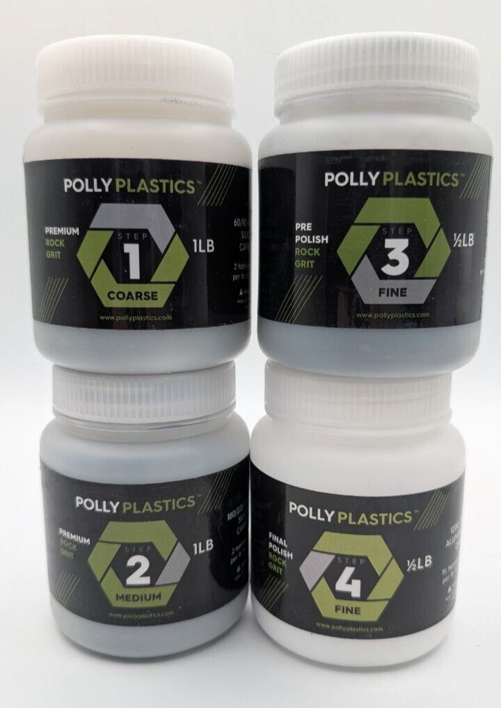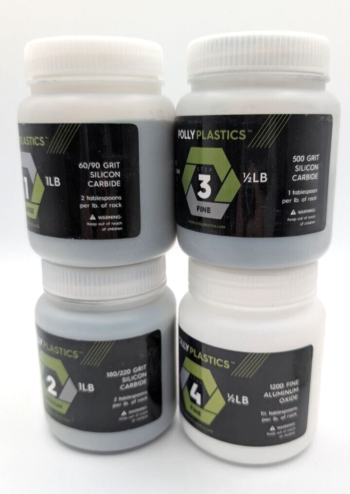- PACKAGE INCLUDES - 1 lb. 60/90 coarse silicon carbide grit, 1 lb. 180/220 medium silicon carbide grit, ½ lb. 500 fine silicon carbide, ½ lb 1200 aluminum oxide polish, 1.5 lbs. non-abrasive ceramic filler cylinders and an easy-to-follow instructions manual.