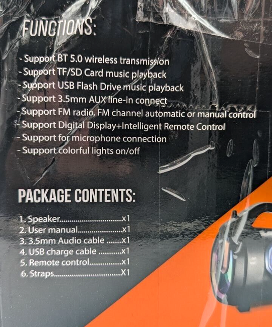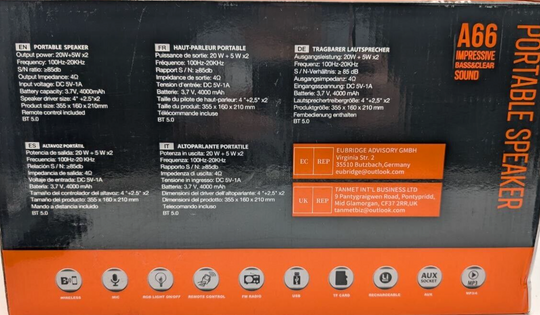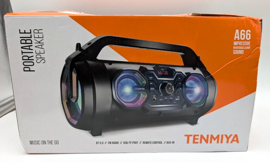 Brand: TenmiyaType: Portable Speaker SystemAudio Inputs: AUX,USB,DC 5VBattery Capacity: 4000 mAhColor: BlackModel: A-66Connectivity: BluetoothFeatures: BluetoothCountry/Region of Manufacture: China Tenmiya Portable Bluetooth Speaker with Subwoofer, FM Radio, RGB Colorful Lights (AR84) Item has been used before -...Regular price $35.99Quick view -