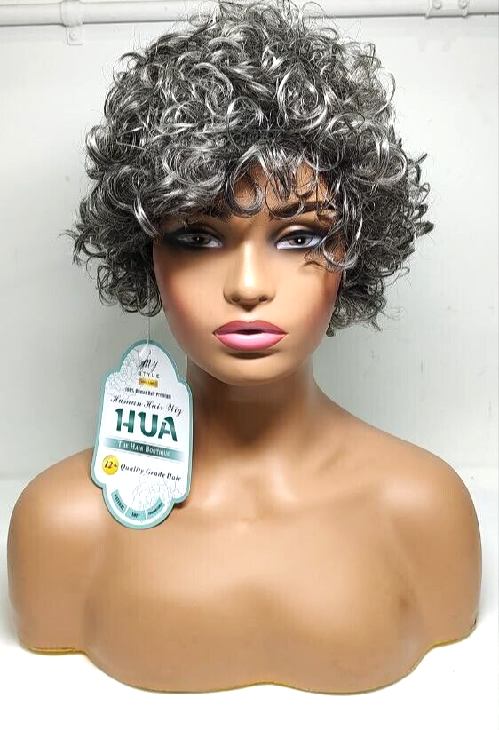 HUA Grey Human Hair Wig with Bangs 150% Density Wear and Go Glueless