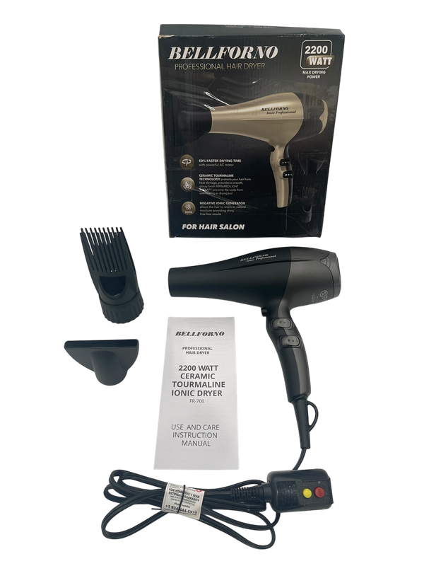 BELLFORNO Hair Dryer 2200W Ionic Ceramic Tourmaline Gray/Black FR-700 (JS881)