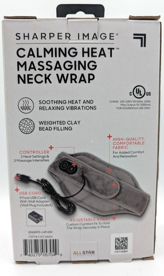 Brand: Sharper ImageType: Electric Heating PadDepartment: AdultPower Source: ElectricColor: GrayModel: Calming ComfortFeatures: Reusable,USB Connection,With Temperature Settings,Heated,MassagingMaterial: FabricCountry/Region of Manufacture: China Sharper Image Calming Heat Neck Wrap, Vibrating Massaging Electric Heated Scarf (AR204) Item is New in...Regular price $19.99Quick view -