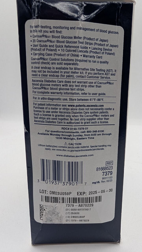 IsListingCreatedFromScratch: FalseBrand: AscensiaType: Glucose MonitorProduct Line: Ascensia CONTOUR NEXTDisplay Type: DigitalExpiration Date: 06/30/2025Country/Region of Manufacture: JapanUPC: 301937379017Ascensia CONTOUR NEXT Blood Glucose Monitoring System – All-in-One Kit (AR319)Item is new and unused. Please anticipate signs of handling....Regular price $36.99Quick view -