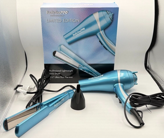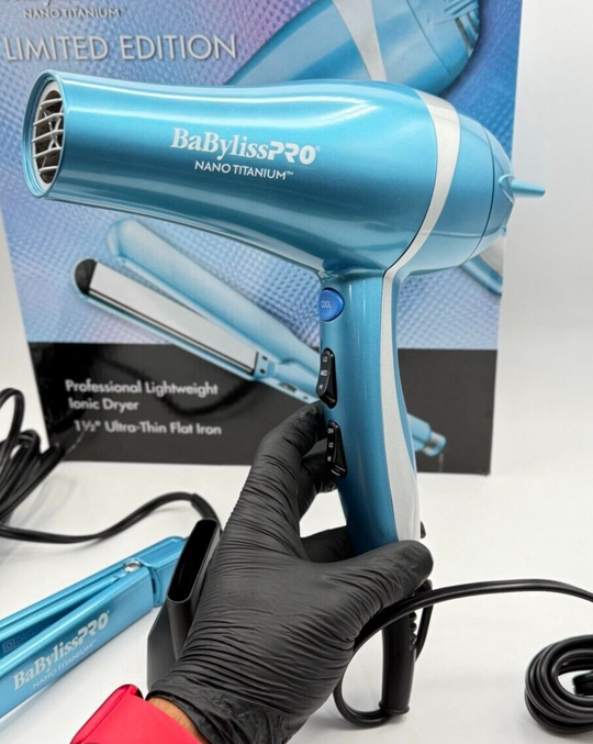 Sold out              Vendor: BaByliss BabylissPro Nano Titanium Limited Edition Duo- Dryer & 1.5in Ulta Thin Flat Iron Brand: BaBylissType: Flat IronPower Source: ElectricHeating Plate Material: TitaniumColor: BlueFeatures: Adjustable Heat Settings,Cool Tip,Instant Heat,Ionic TechnologyHair Type: All Hair Types,Coarse Hair,Color Treated Hair,Curly Hair,Damaged Hair,Dry Hair,Fine Hair,Long Hair,Normal Hair,Oily Hair,Thick Hair,Wavy HairMaterial: PlasticMaximum Temperature: 450 °FPower:...Regular price $90.00Quick view