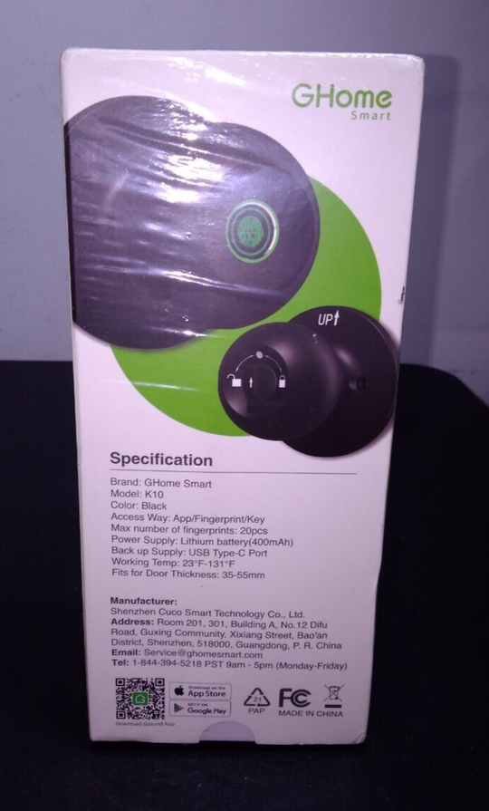 Brand: GHOMEType: Fingerprint & Biometric Smart Door LockItems Included: DeadboltColor: MATTE BLACKBattery Required: YesModel: FINGER PRINTSmart Home Protocol: Wi-FiFinish: MatteSuitable For: Front Door GHOME Smart Fingerprint Door Knob (LA245) Item is new and unused. Please anticipate...Regular price $50.00Quick view  -