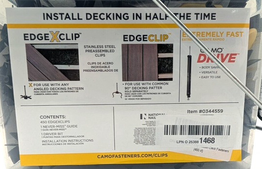 Brand: CAMO EDGEXMaterial: Stainless SteelThread Size: Partially ThreadedHead Style: TrimCAMO EDGEX™ Clip Hidden Deck Fasteners - 450 ct (AR216) Item is new and unused. Please anticipate signs of handling. Outer packaging may have cosmetic imperfections/damage -...Regular price $157.50Quick view  -