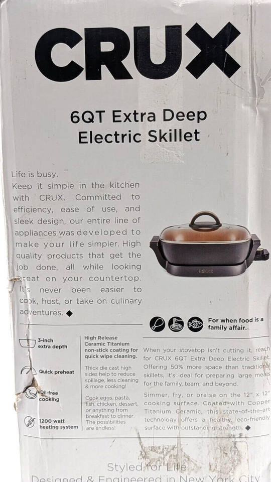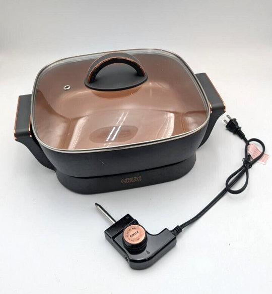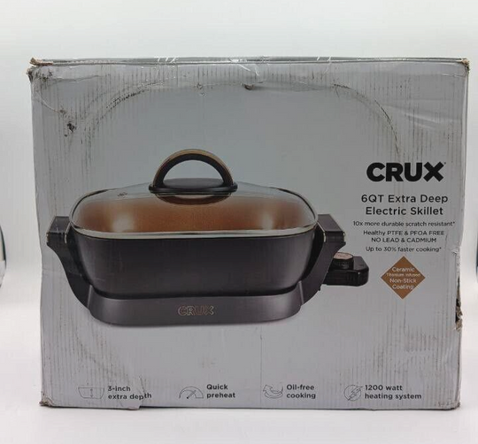 Power Source: ElectricColor: Black/CopperMaterial: CeramicBrand: CruxType: Electric SkilletCapacity: 6 qtVoltage: 120 VoltsModel: 22899Country/Region of Manufacture: ChinaItem Weight: 6 PoundsPower: 1200 W CRUX 6QT Electric Skillet with Glass Lid Scratch Resistant Ceramic Pan - READ (AR99) Item...Regular price $34.99Quick view -