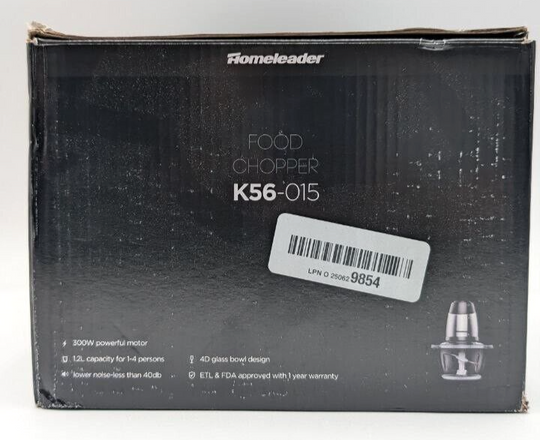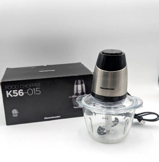 Brand: HomeleaderPower Source: ElectricCapacity: 5 cupColor: Stainless Steel and BlackModel: K56-015Number of Blades: 4Country/Region of Manufacture: ChinaComponents Included: ChopperPower: 300 W Homeleader Electric Food Chopper, 5-Cup Food Processor - 1.2L Glass Bowl (AR88) Item is new...Regular price $34.99Quick view -