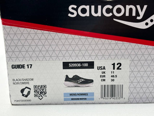 UK Shoe Size: 11Shoe Shaft Style: Low TopStyle Code: s20936-100Closure: Lace UpUS Shoe Size: 12EU Shoe Size: 46.5Color: BlackBrand: SauconyDepartment: MenType: AthleticModel: Saucony GuideStyle: SneakerShoe Width: MPerformance/Activity: Running & JoggingProduct Line: Saucony ShadowSaucony Men's Guide 17...Regular price $62.00Quick view -