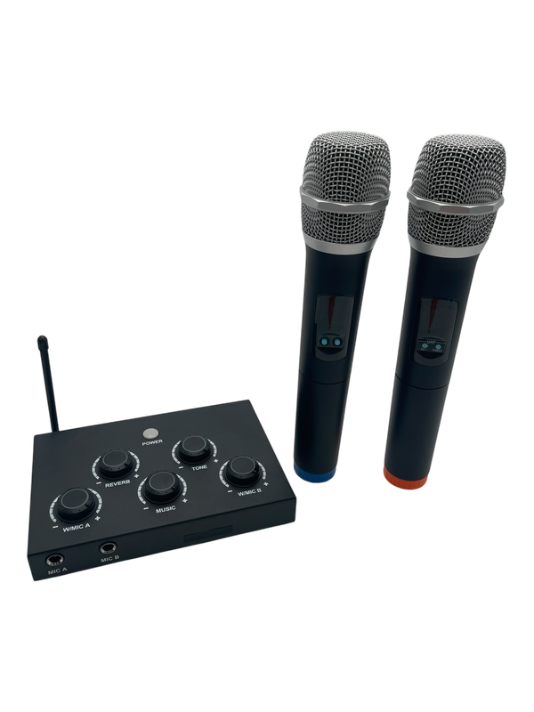- Dual Microphone Setup: Includes 2 wireless handheld mics + 2 wired inputs with independent volume controls