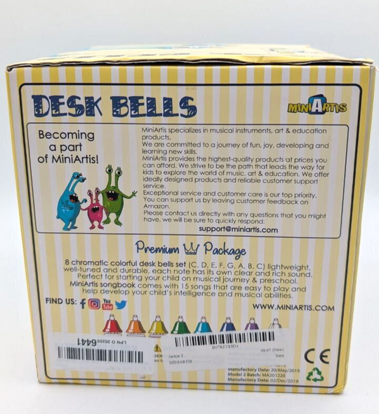 IsListingCreatedFromScratch: FalseType: Desk BellsBrand: MINIARTISMaterial: MetalFeatures: LightweightModel: MA-DBCO-01ACountry/Region of Manufacture: ChinaNumber of Pieces: 8Items Included: 8 Chromatic Coloful desk bell set and SongbookMINIARTIS Desk Bells for Kids, Educational Music Toys, 8 Notes/Color Hand Bells (AR299)Item is...Regular price $39.99Quick view