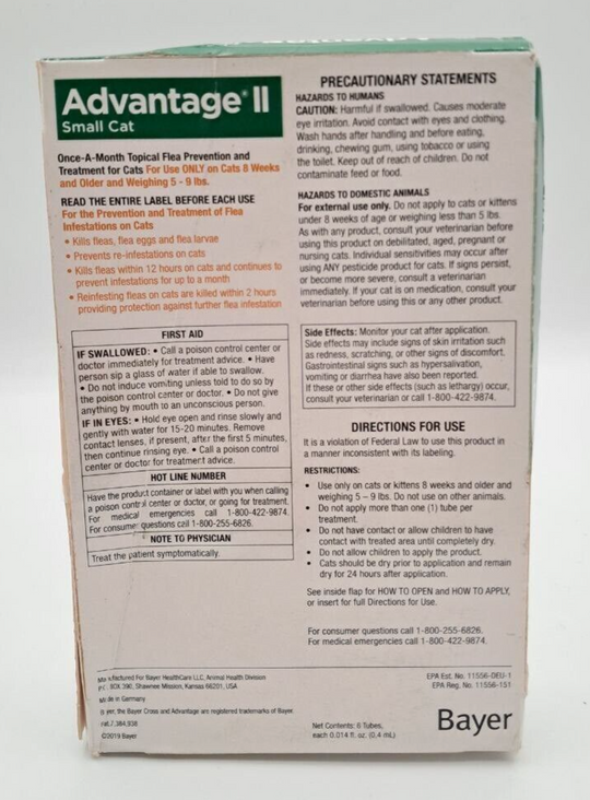 Country/Region of Manufacture: GermanyMPN: 86336820EPA Registration Number: 11556-151Brand: AdvantageType: Spot-On TreatmentModel: 86336820Advantage II Small Cat Vet-Recommended Flea Treatment & Prevention (MD434) Item is Brand New, packets are SEALED. Unused, unopened! Outer packaging may have cosmetic damage...Regular price $36.00Quick view -