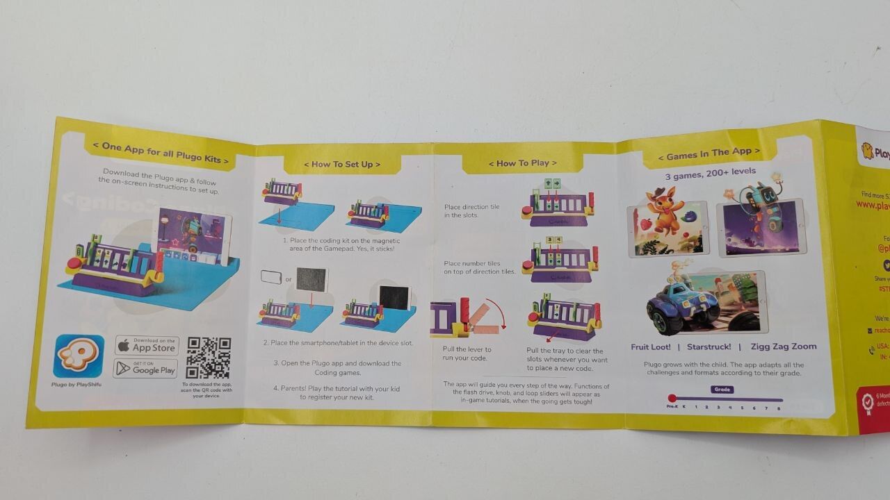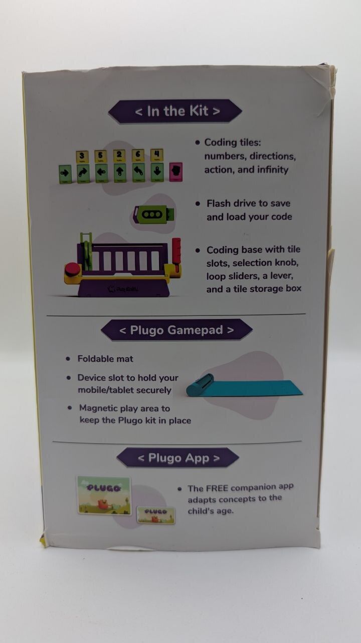 - Includes 33 coding tiles, 1 coding base, 1 flash drive, 1 gamepad, and a quick start guide. Download the Plugo app to unlock 4 games and 200+ levels with engaging animations and storytelling.