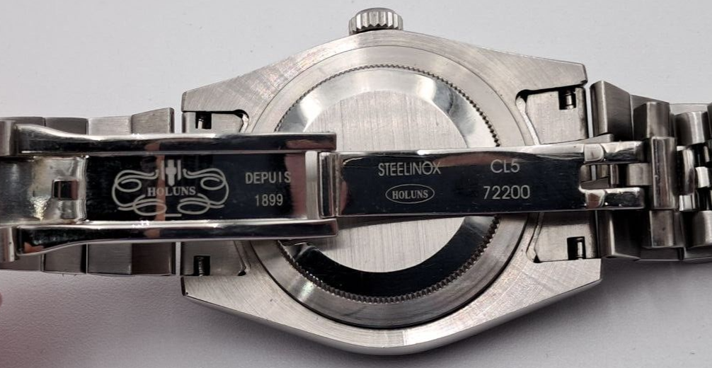 - Stainless steel case, mineral crystal, Stainless steel band with folding clasp